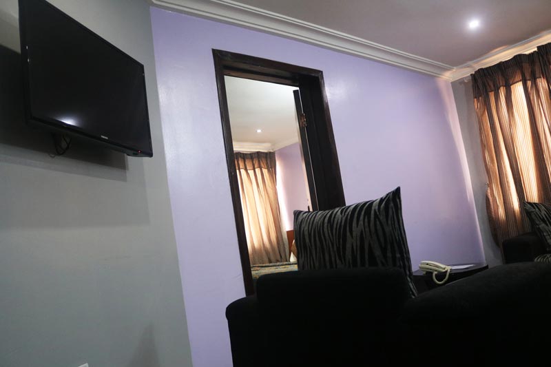 A standard hotel suite comprising of a large bedroom and a living area. It is comprised of 2 toilets and a jacuzzi. The bed room boasts of a King sized bed, reading table and chair. The living area has 1 two-seater and 2 single chairs.